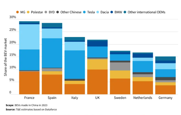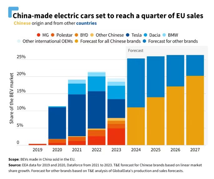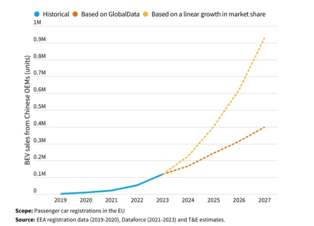 如果根据T&E的线性预计,中国品牌2024年在欧洲电动汽车市场的份额将达到11%,在2027年将达到20%。 如果根据GlobalData的预计,中国品牌2024年在欧洲纯电动汽车销量为16.8万辆,占比8.1%,2025年为24.3万辆占比8.5% 。
