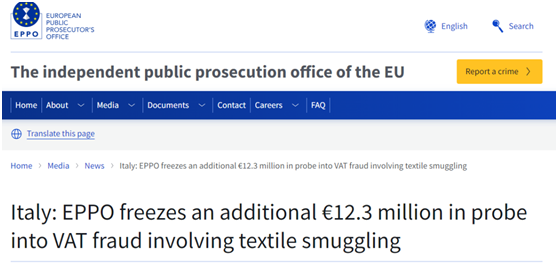 近日,欧洲检察官办公室(EPPO)通报称,一批自中国进口的价值约6300万欧元(约4.85亿人民币)纺织品,因货主、货代物流等相关企业涉嫌走私、伪造和开具假发票而被扣押,并且涉事企业被冻结了近2.8亿元资产!
